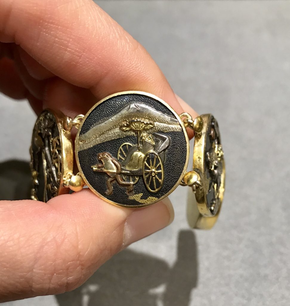 In the same cabinet at Revival Vintage Jewels, lies a charming gold coin bracelet. It is from the mid to late 1880s with Japanese images. On it, I see a sailboat, a heron as well as toads pulling each other in rickshaws. I wonder what folklore inspired them.