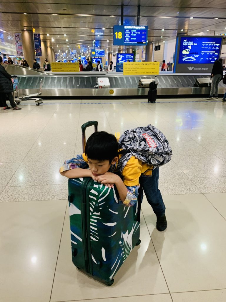 This winter, I decided to take just M4 to Korea to check the ski slopes in PyeongChang out, just the two of us. We took the red eye flight. Consequently, most photos of M4 journeying are slumped across his luggage like a snowman in spring.